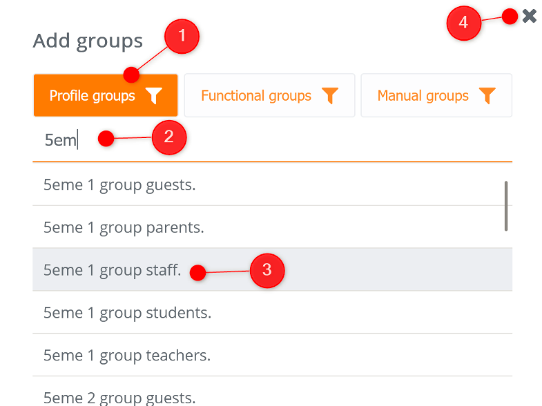 2- Enter a few letters of the group name. In the above example, the admin wants to select all the profile groups affiliated to the 5eme 1 class.
