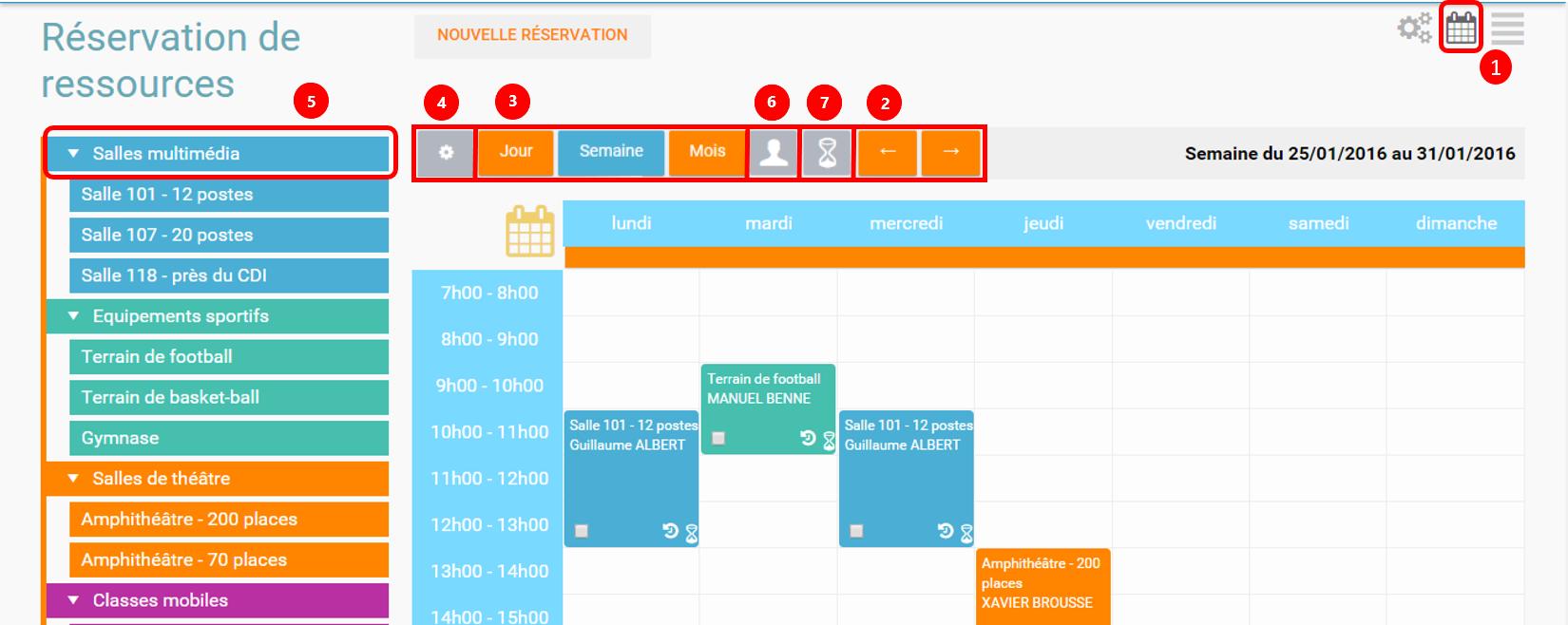 Para intervenir sobre una reserva para modificarla, confirmarla o eliminarla, basta con marcar la casilla correspondiente de esta reserva y los botones de acción que aparecen abajo de la ventana.Si la reserva no dispone de una casilla, significa que el usuario no está autorizado para intervenir sobre la reserva seleccionada.