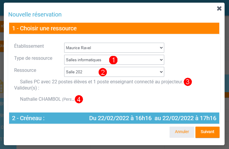 - Los nombres de las personas que pueden validar la reserva (aparecen únicamente si las reservaciones para este recurso deben someterse a una validación).