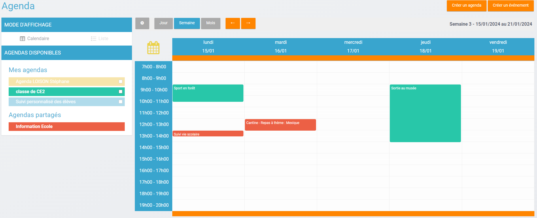 Les événements créés sont affichés sur la vue calendrier avec comme couleur de fond celle de l’agenda auquel ils appartiennent.